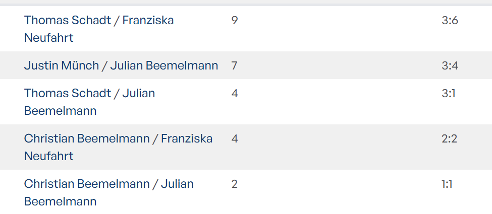 Verbesserungspotential: Anders als in der Vorsaison, wo unsere Stammdoppel jeweils positiv gespielt haben, konnten wir uns diese Saison weniger darauf verlassen. Die Bilanz der Doppel mit mindestens 2 Einsätzen lautet: