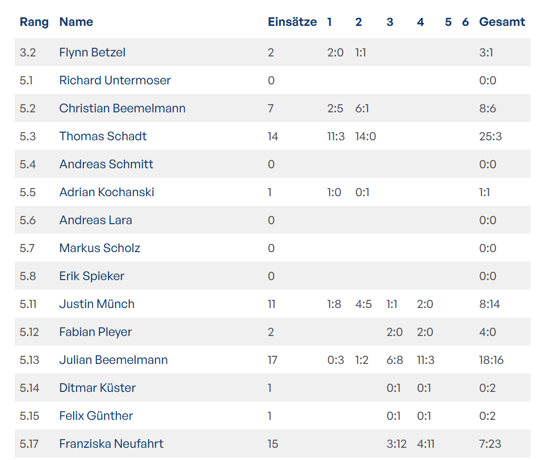 Verbesserungspotential: Anders als in der Vorsaison, wo unsere Stammdoppel jeweils positiv gespielt haben, konnten wir uns diese Saison weniger darauf verlassen. Die Bilanz der Doppel mit mindestens 2 Einsätzen lautet: